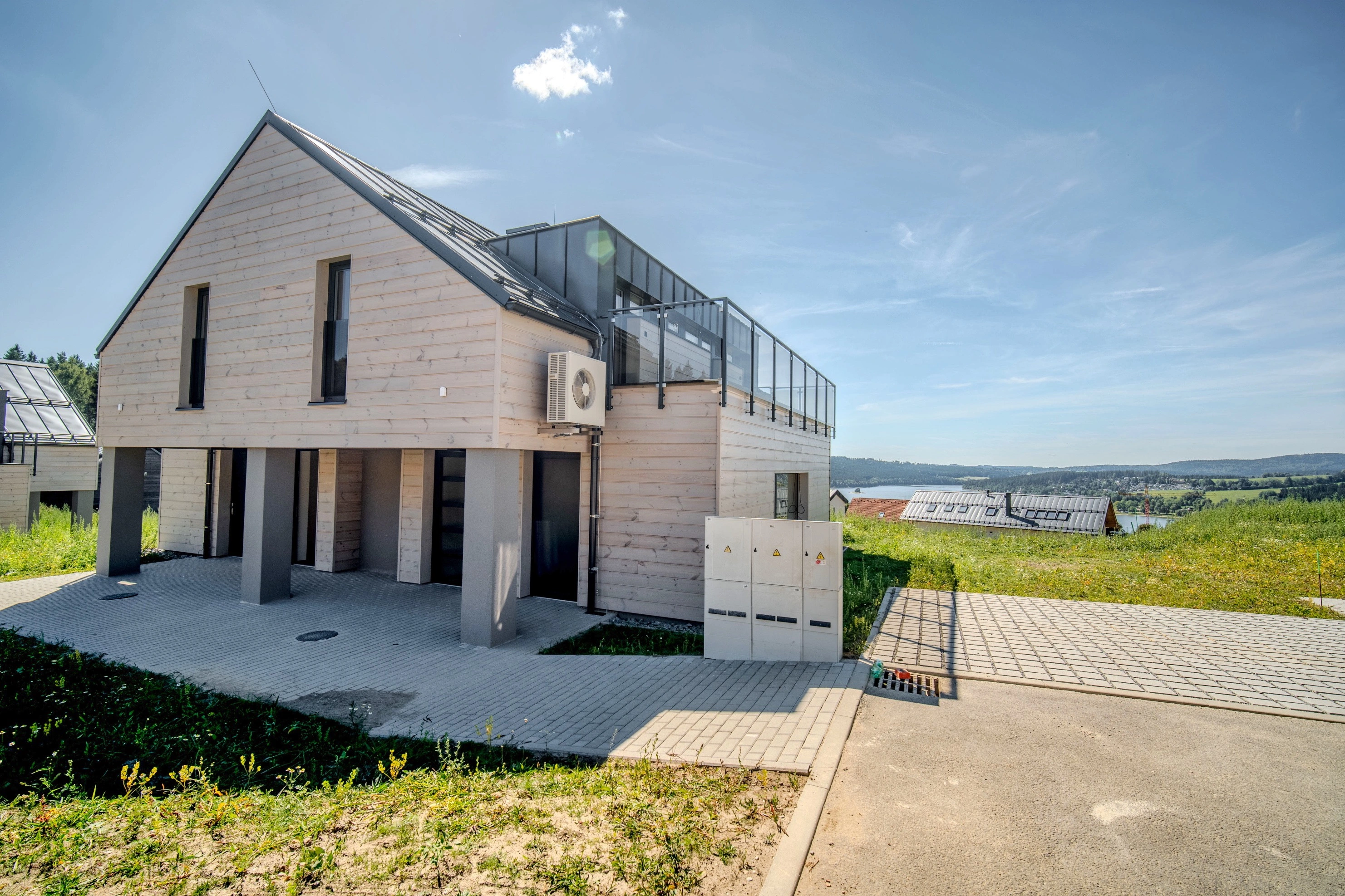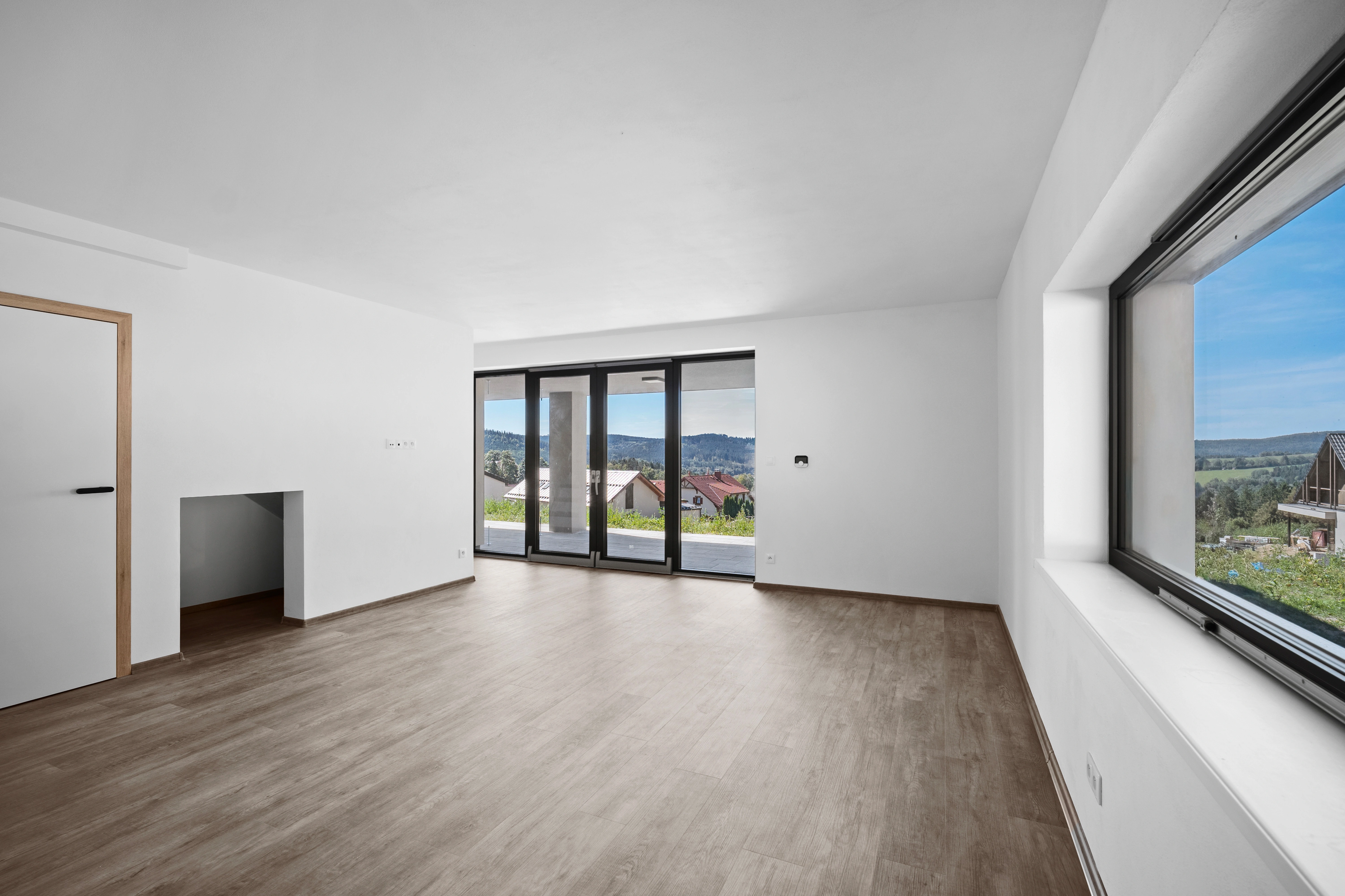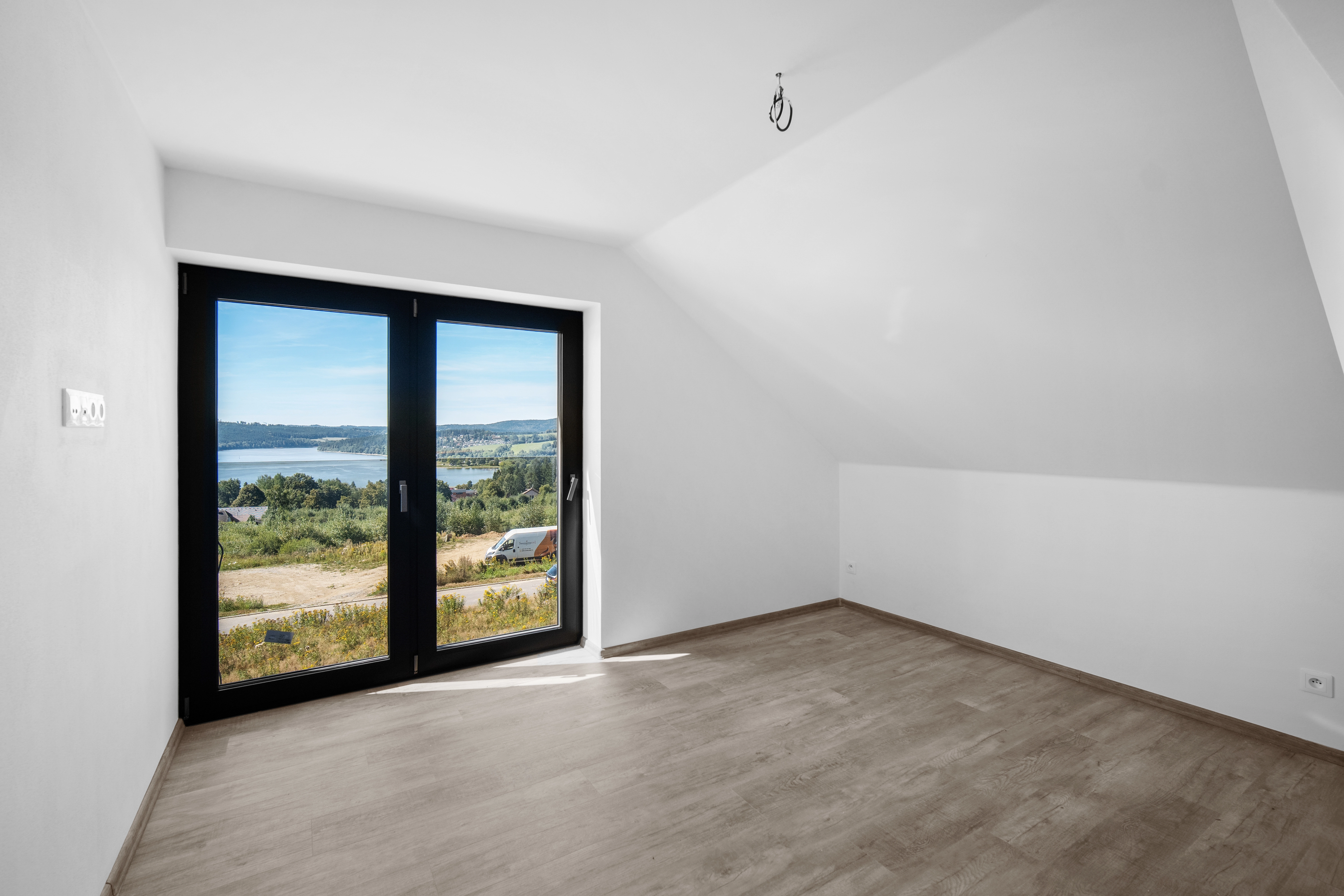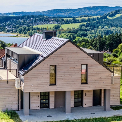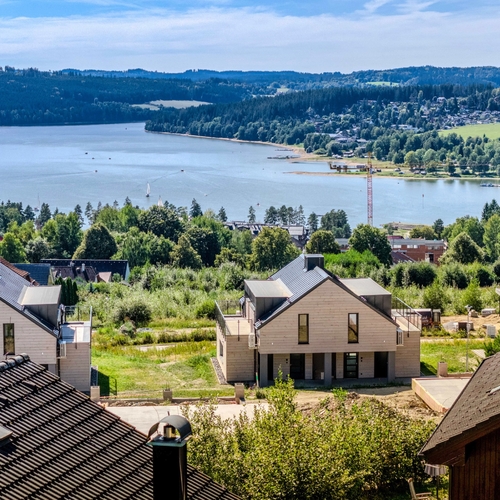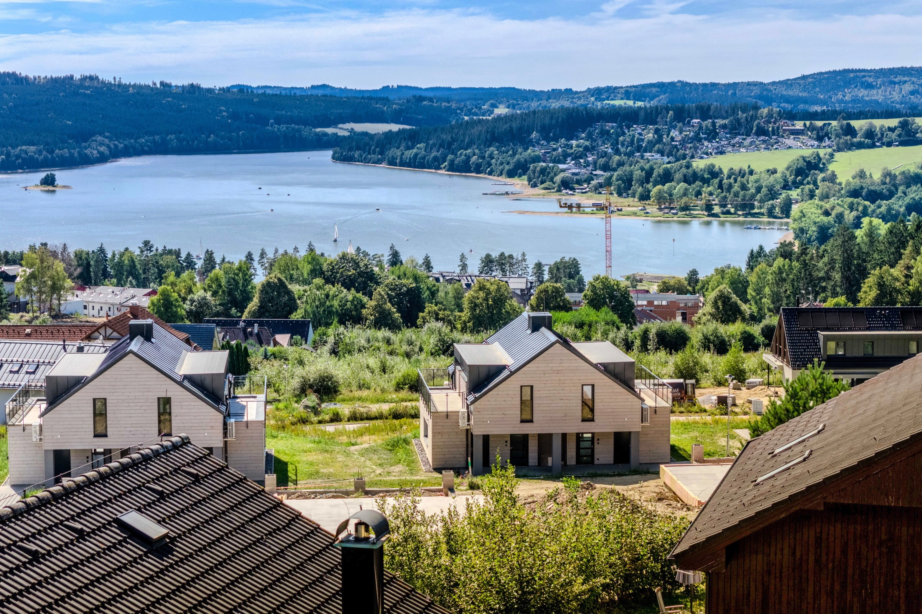 Nabízím k prodeji půldům s nádherným výhledem na vodní nádrž Lipno a dostupností od Mariny v pěší vzdálenosti. Řadový dům dispozičně 3+kk s podlahovou plochou 115,3 m2 se nachází v kopci od přilehlého centra volnočasových aktivit a maximální občanskou vybaveností Lipna Nad Vltavou. Vysoký standard domu zahrnuje dřevěná okna v antracitové barvě včetně HS portálů, s trojskly. Smart dálkové otevírání hlavních dveří (protipožární) pomocí číselného kódu. Kvalitní vinylové podlahy v dekoru přírodního dřeva. V koupelně a na toaletě, značky Geberit, je položená keramická rektifikovaná dlažba doplněná keramickými obklady. Dveře jsou spolu obložkovými zárubněmi od renomované značky SAPELI.