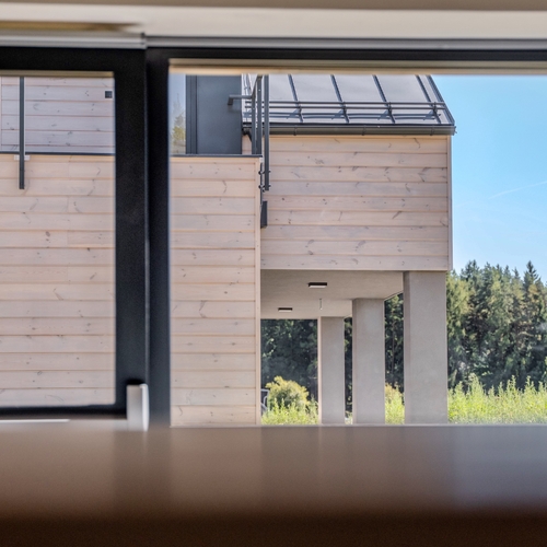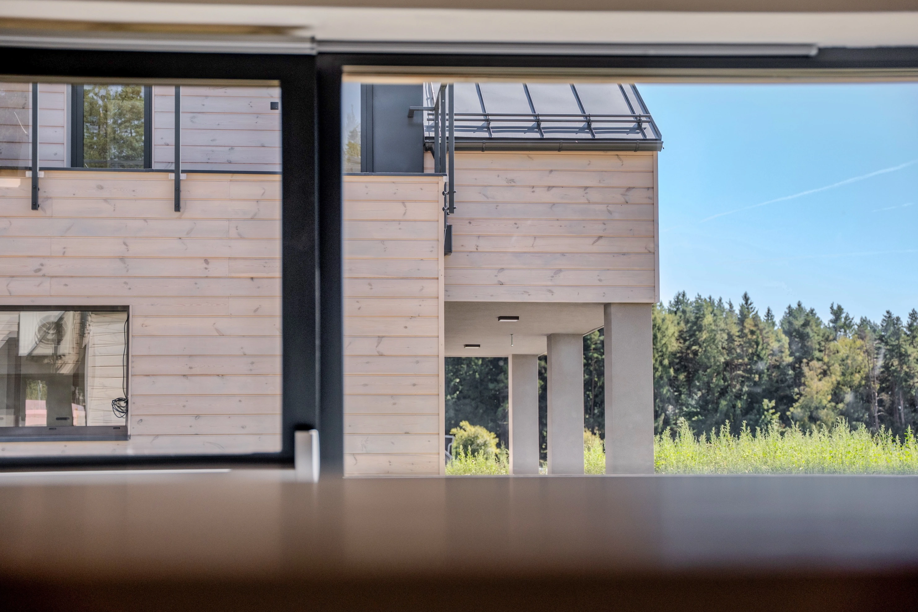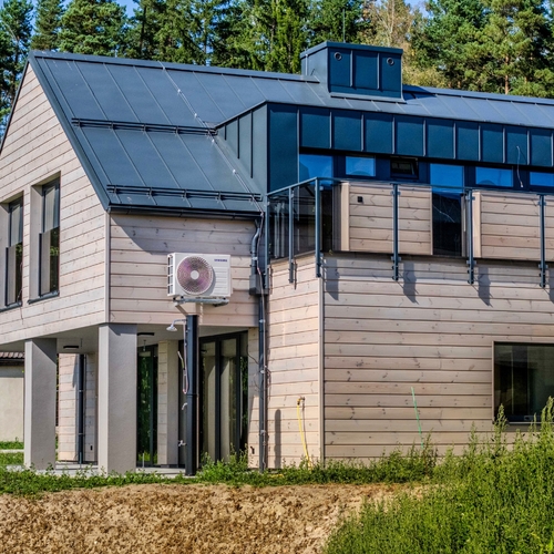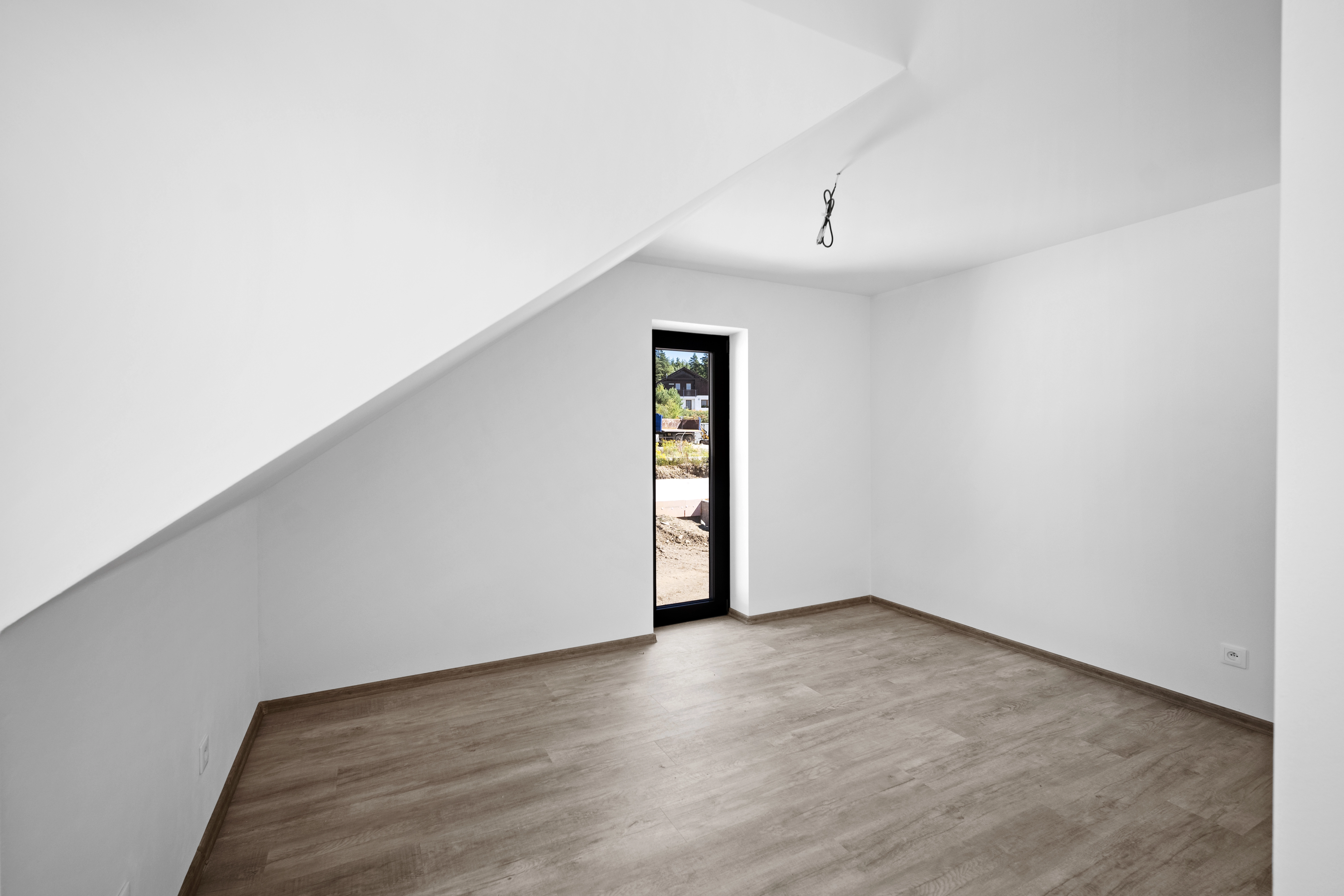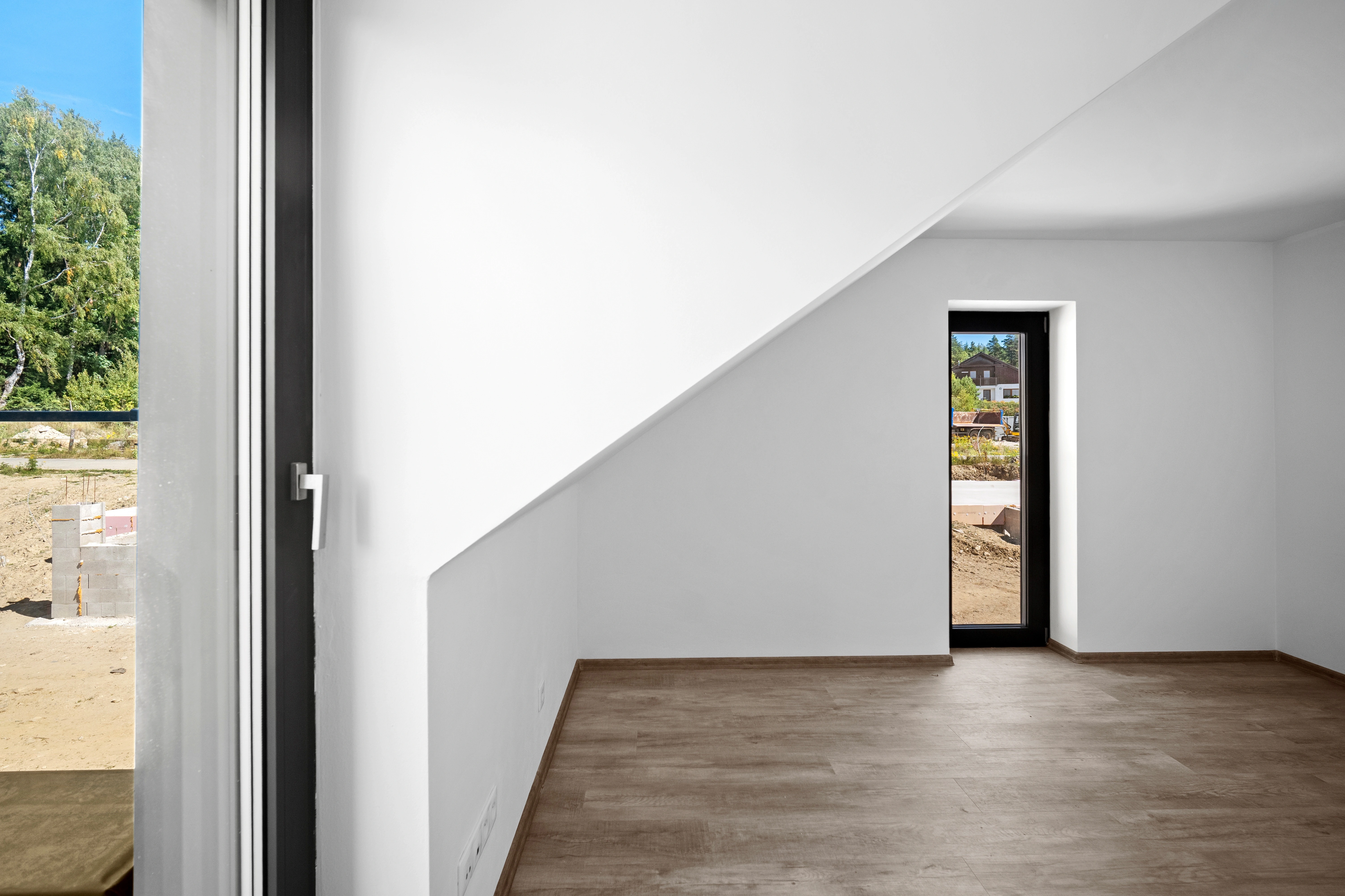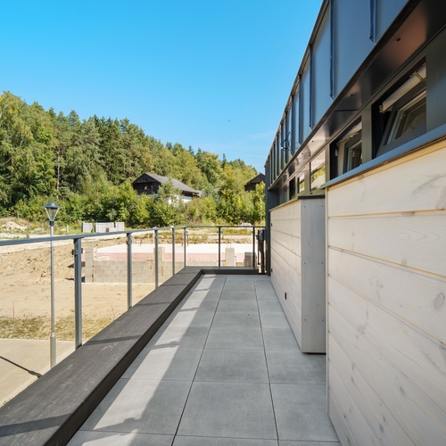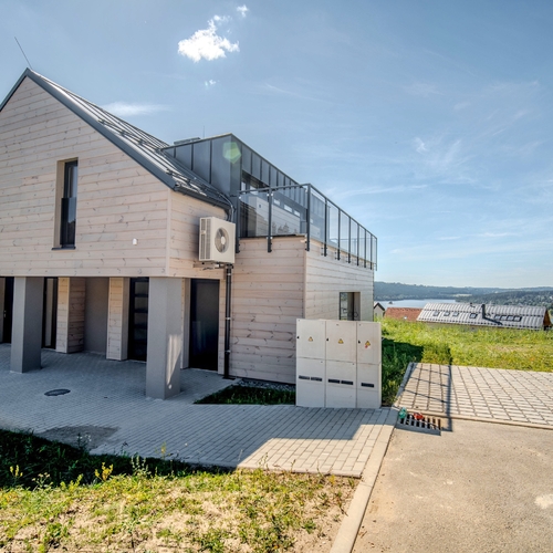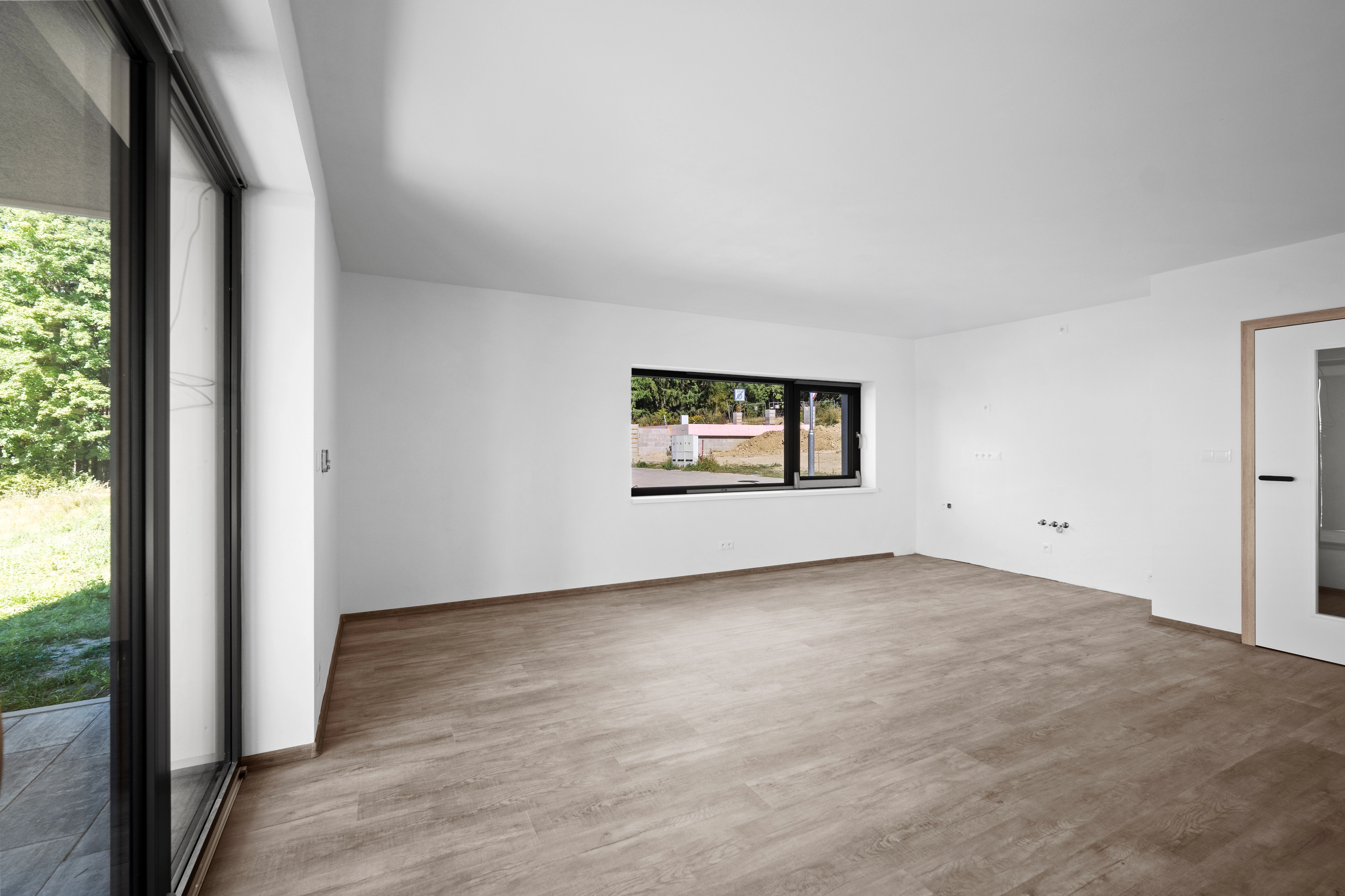 Designový ráz domu zajišťuje venkovní obklad z pravého dřeva. Vytápění domu je pomocí tepelného čerpadla. V přízemí domu se nachází předsíň s toaletou a umyvadlem, technickou místností (kterou lze využít také jako sklep pro sportovní vybavení). Obývací pokoj s prostorem pro kuchyňskou linku, se vstupem na terasu a zahradu. |