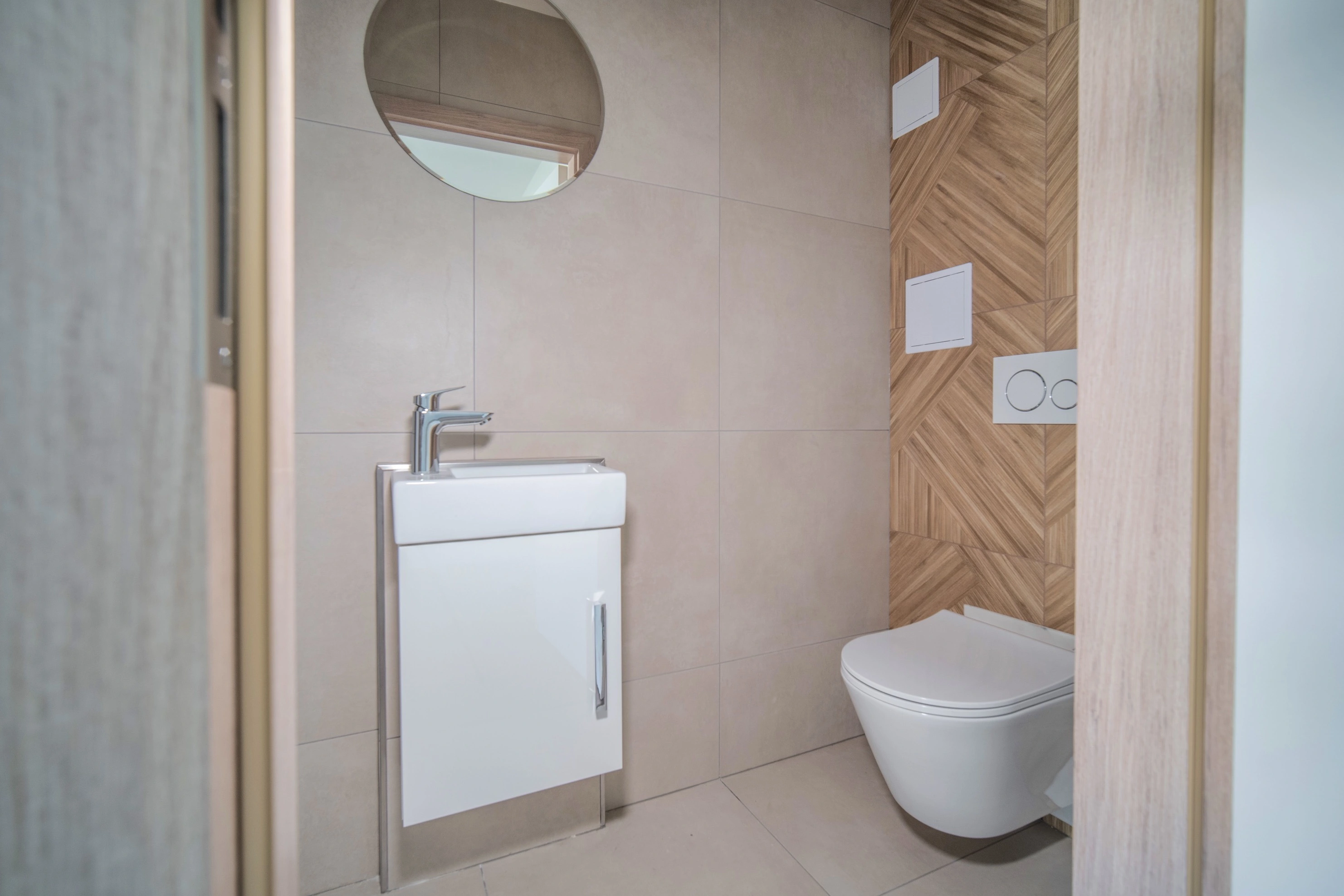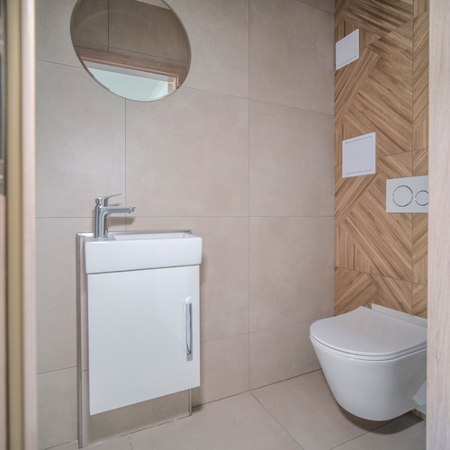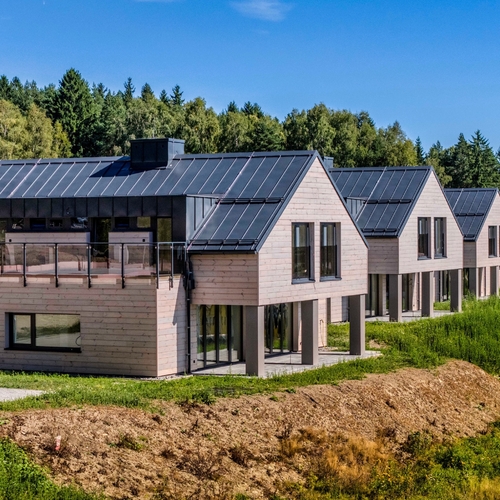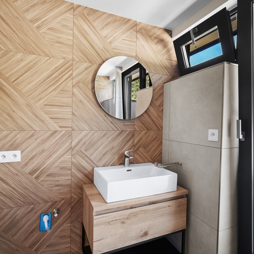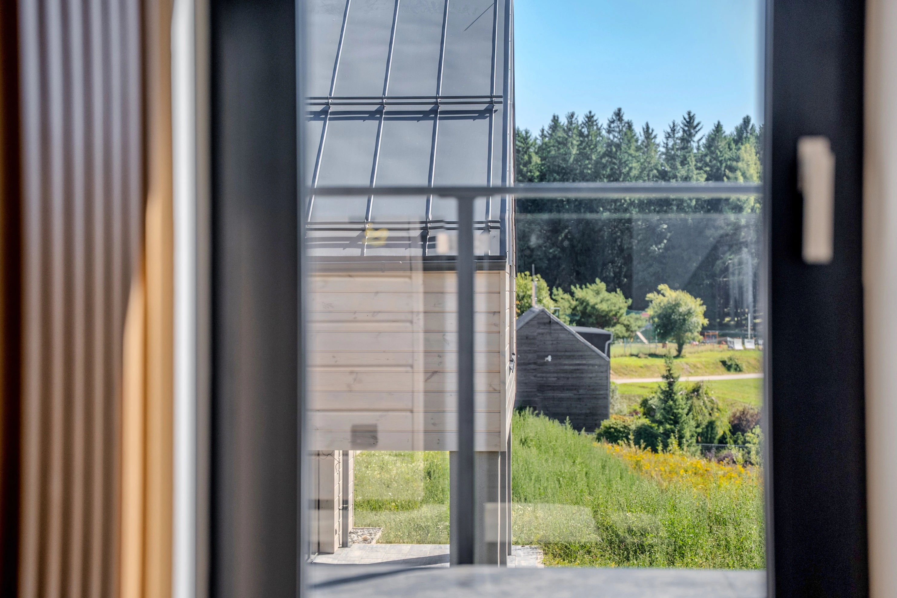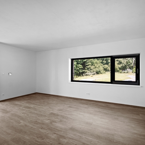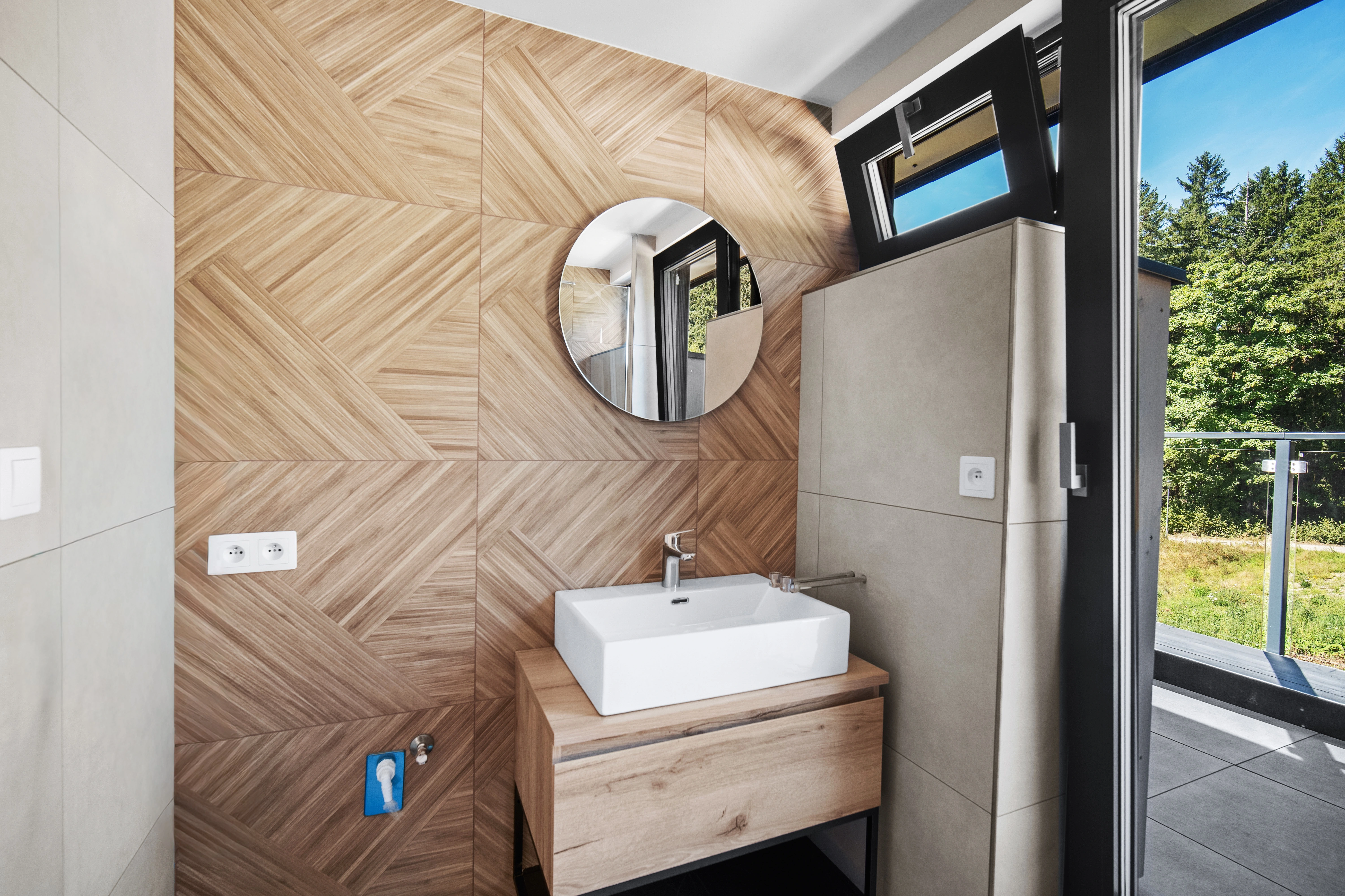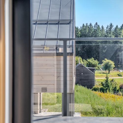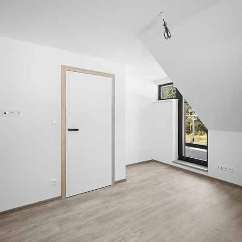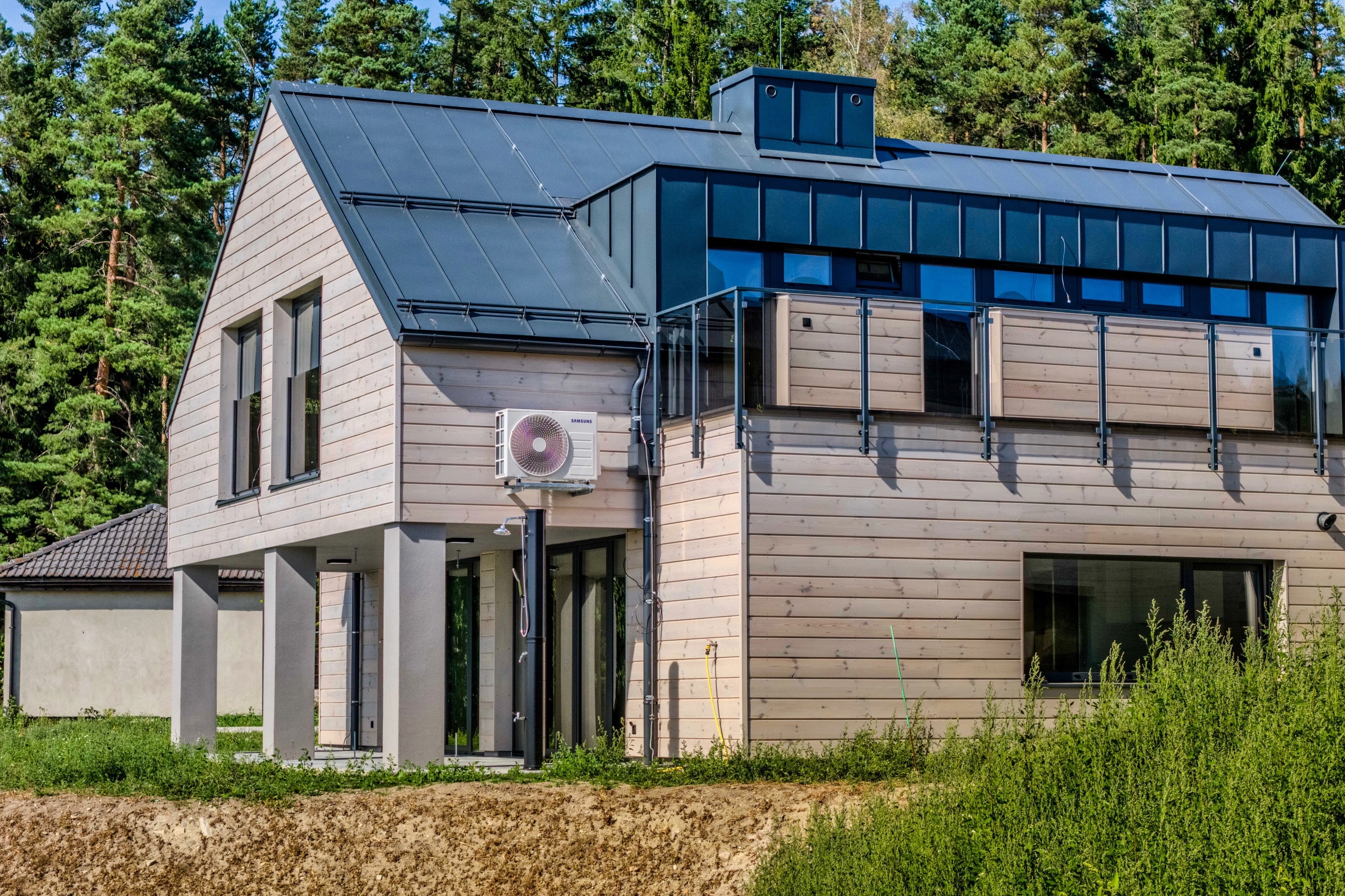Designový ráz domu zajišťuje venkovní obklad z pravého dřeva. Vytápění domu je pomocí tepelného čerpadla. V přízemí domu se nachází předsíň s toaletou a umyvadlem, technickou místností (kterou lze využít také jako sklep pro sportovní vybavení). Obývací pokoj s prostorem pro kuchyňskou linku, se vstupem na terasu a zahradu. |